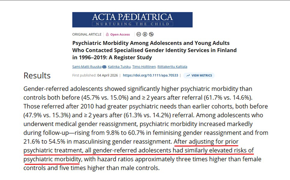 Nové zahraniční studie a odborné revize znovu otevírají otázku, zda takzvaná „genderově afirmativní péče“ ( péče potverzující pohlaví ) skutečně pomáhá dětem a dospívajícím s psychickými obtížemi. Finská data i závěry britské Cass Review ( studie Dr. Hillary Cassové ) ukazují, že důkazní základ pro tyto zásahy je slabý a že slibované zlepšení duševního stavu nelze považovat za samozřejmé. Lidé z Transparent z.s. mohou lomit rukama a ptát se, proč dětem a rodičům v rámci svých vystoupení nehovořili celou a skutečnou pravdu.